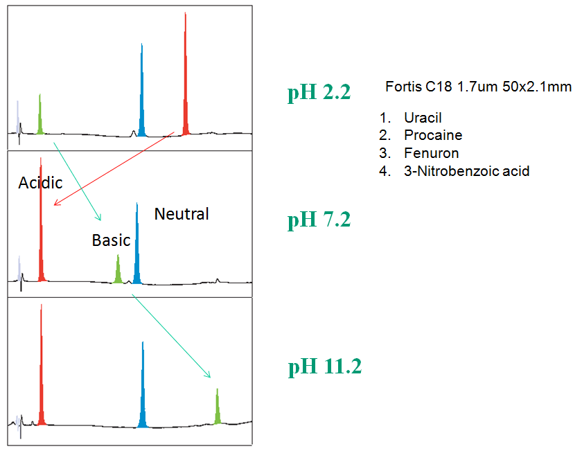 Due to the abiity of Fortis C18 to work across the entire pH spectrum, it provides the ability to develop methods quickly on 1 column using multiple pH's to provide retention and selectivity of analytes.